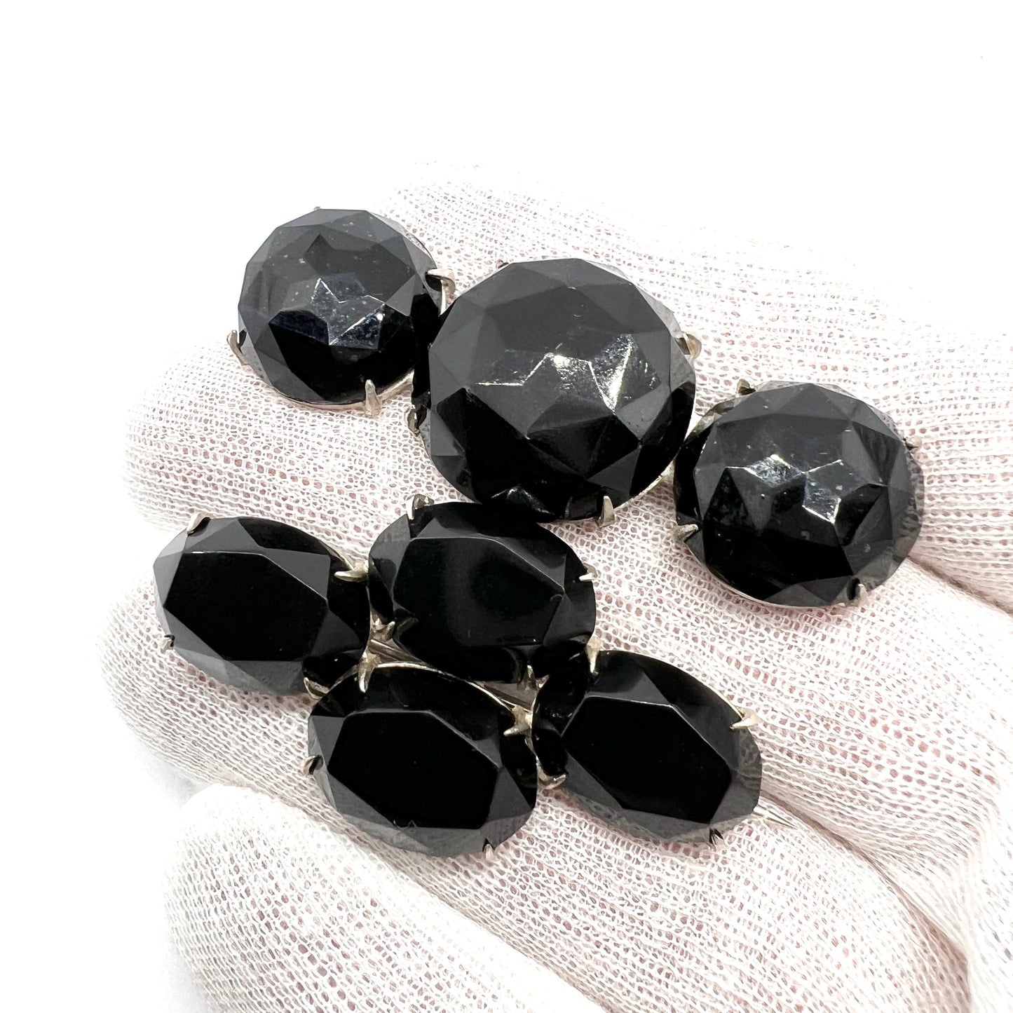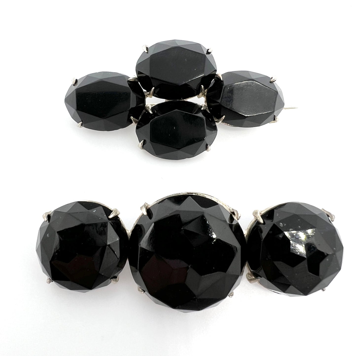 Two antique french jet mourning brooches. Both unmarked. One in silver, one in white metal. Late 1800s, most likely Sweden or Swedish import.