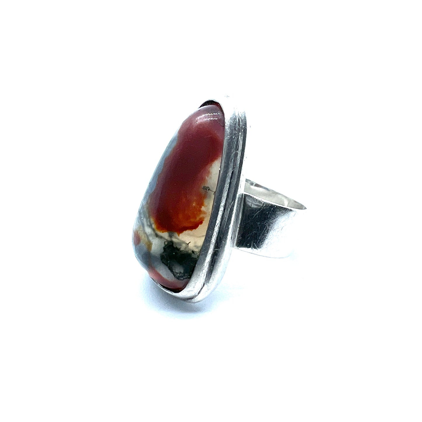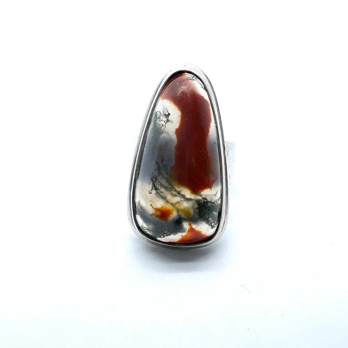 Charming and bold vintage solid silver moss agate ring. Hallmarked for 835 silver and Swedish control marks. c 1950-60s.