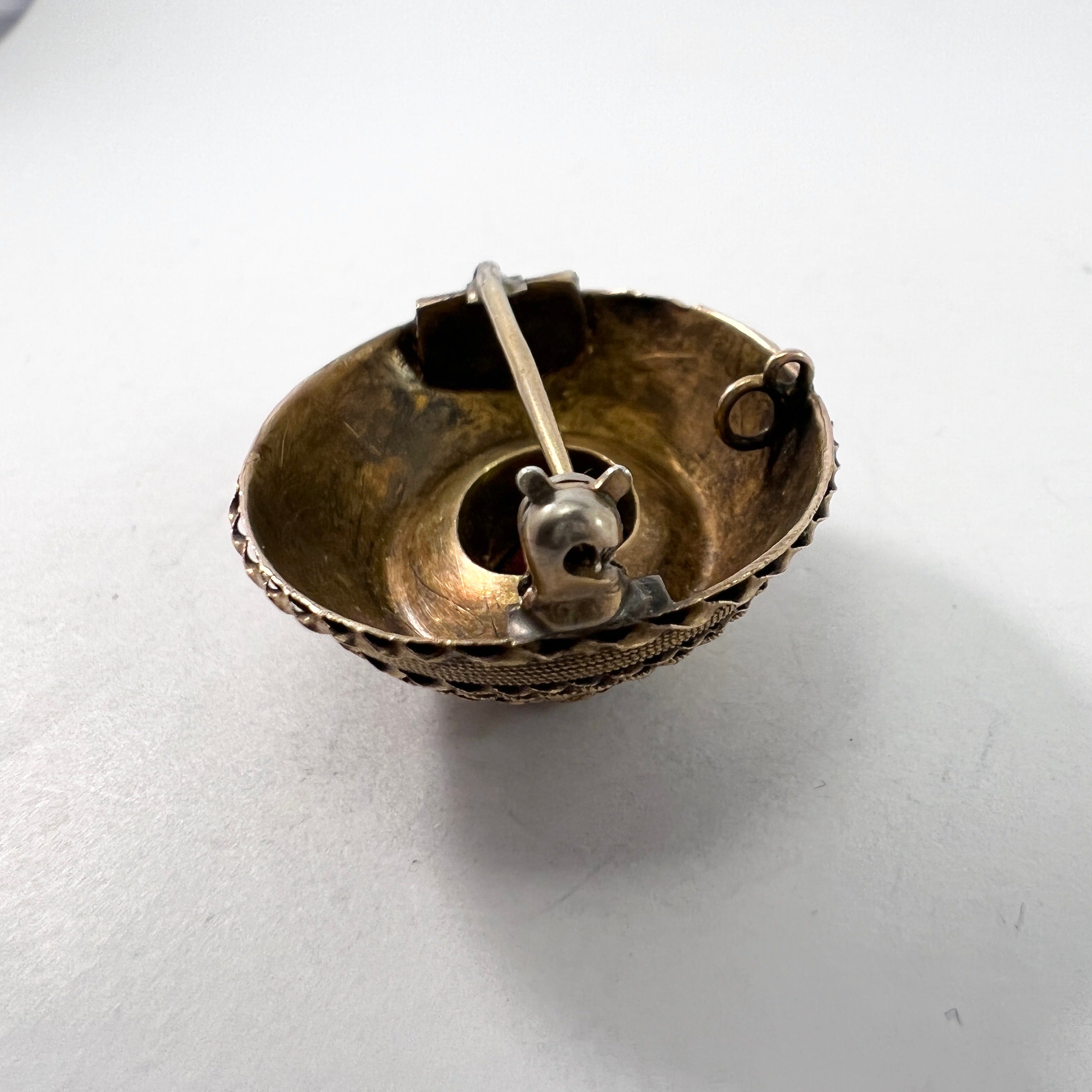 Fair condition: Small pieces of decoration missing, please see red arrows on photo. Stone with minor wear. Originally a pendant only and part of a bigger piece of jewelry. Needle and clasp are c 1920s
