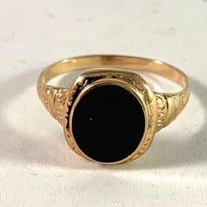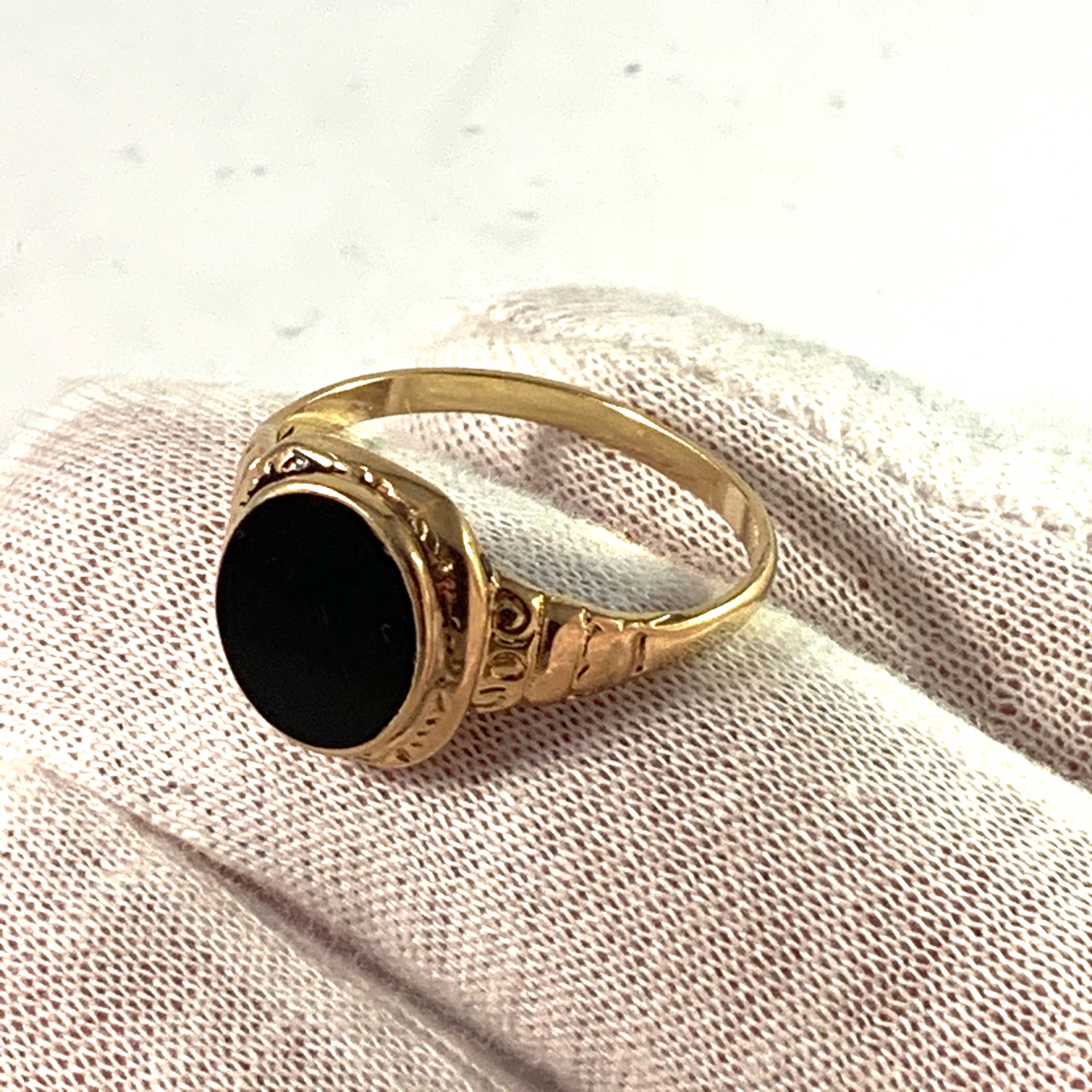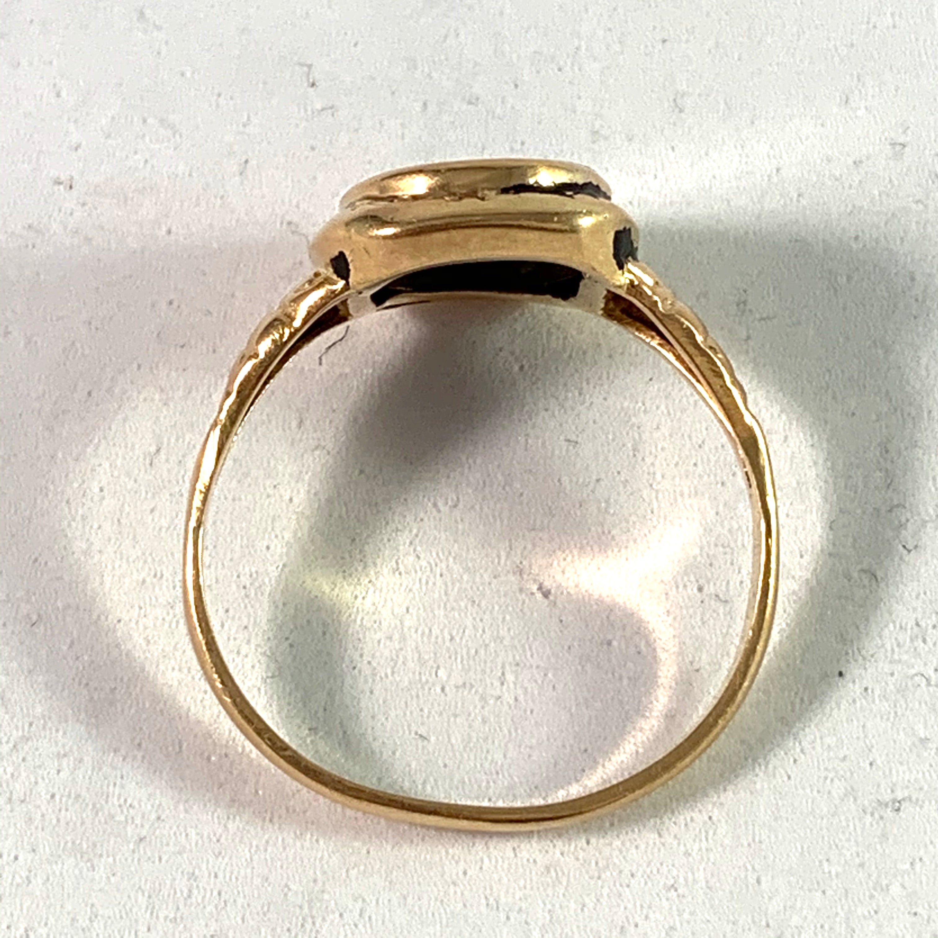Charming antique early Victorian 18k gold onyx and traces of black enamel men's mourning ring. Apparently unmarked . Made c 1850s, continental Europe.