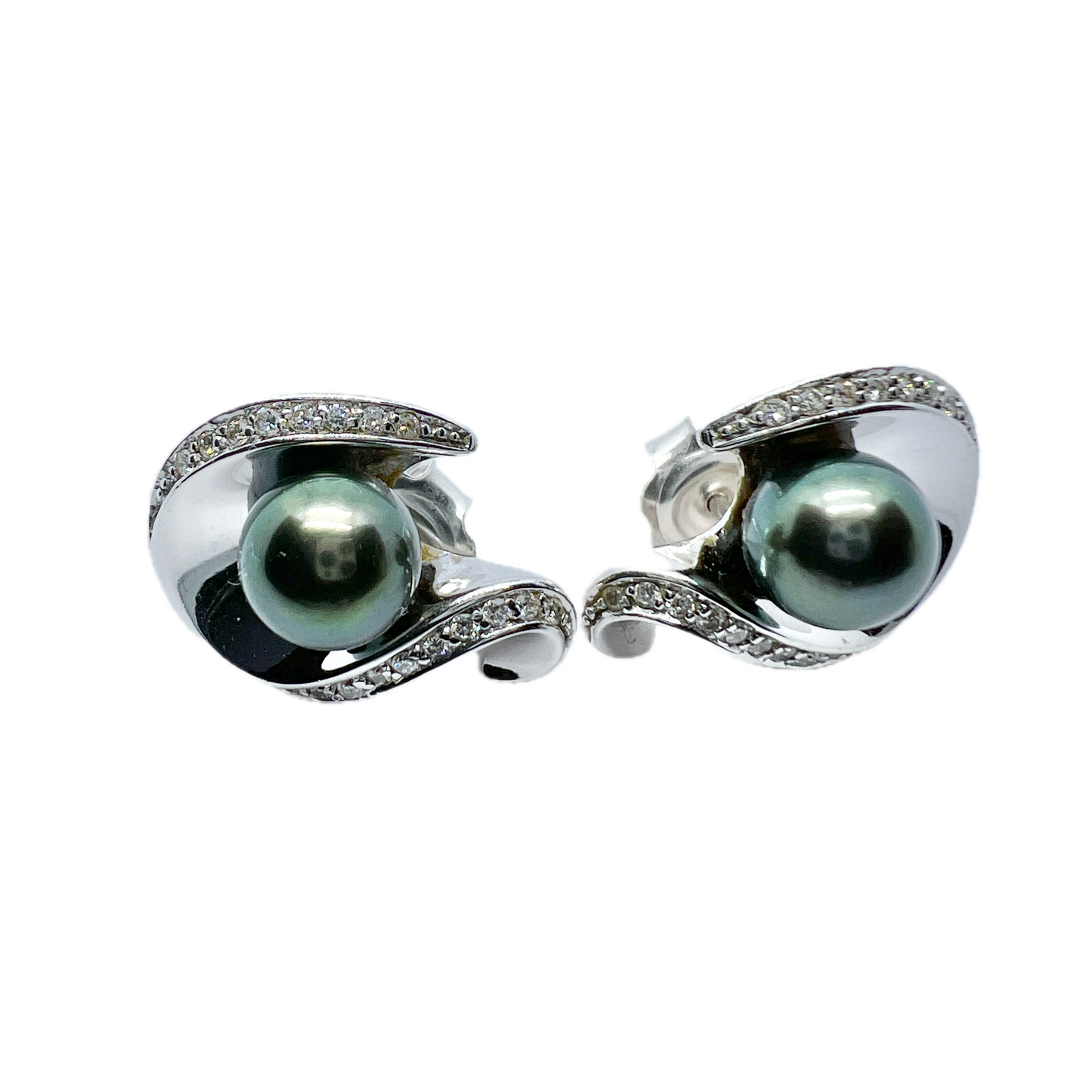 Beautiful vintage 18k gold diamond tahitian pearl (cultured balck/gray perl) earrings. Hallmarked for 18k gold and small unidentified hallmarks, the makers mark is possibly "CAC"