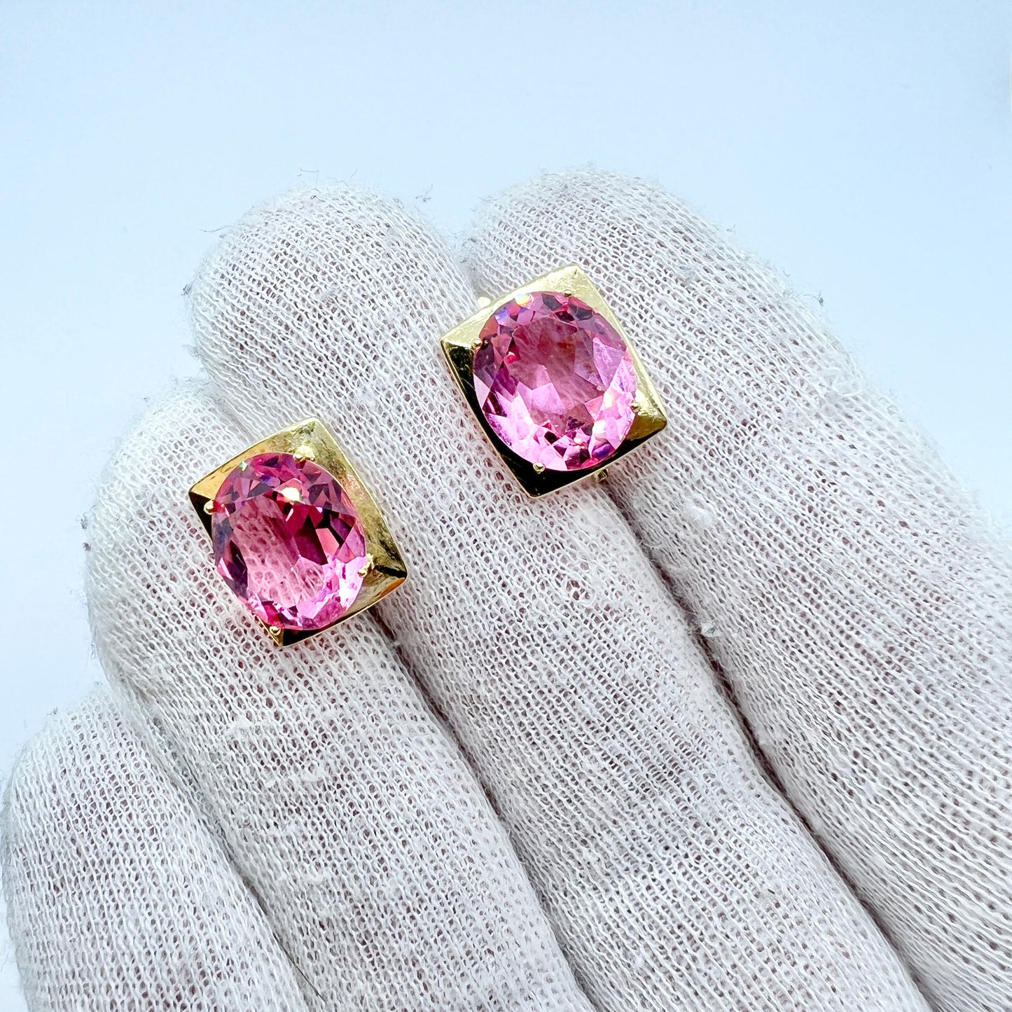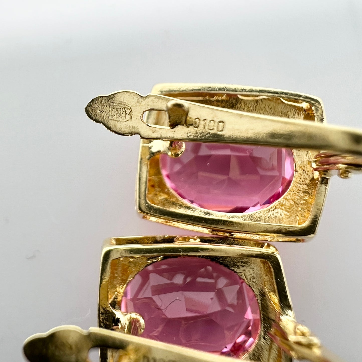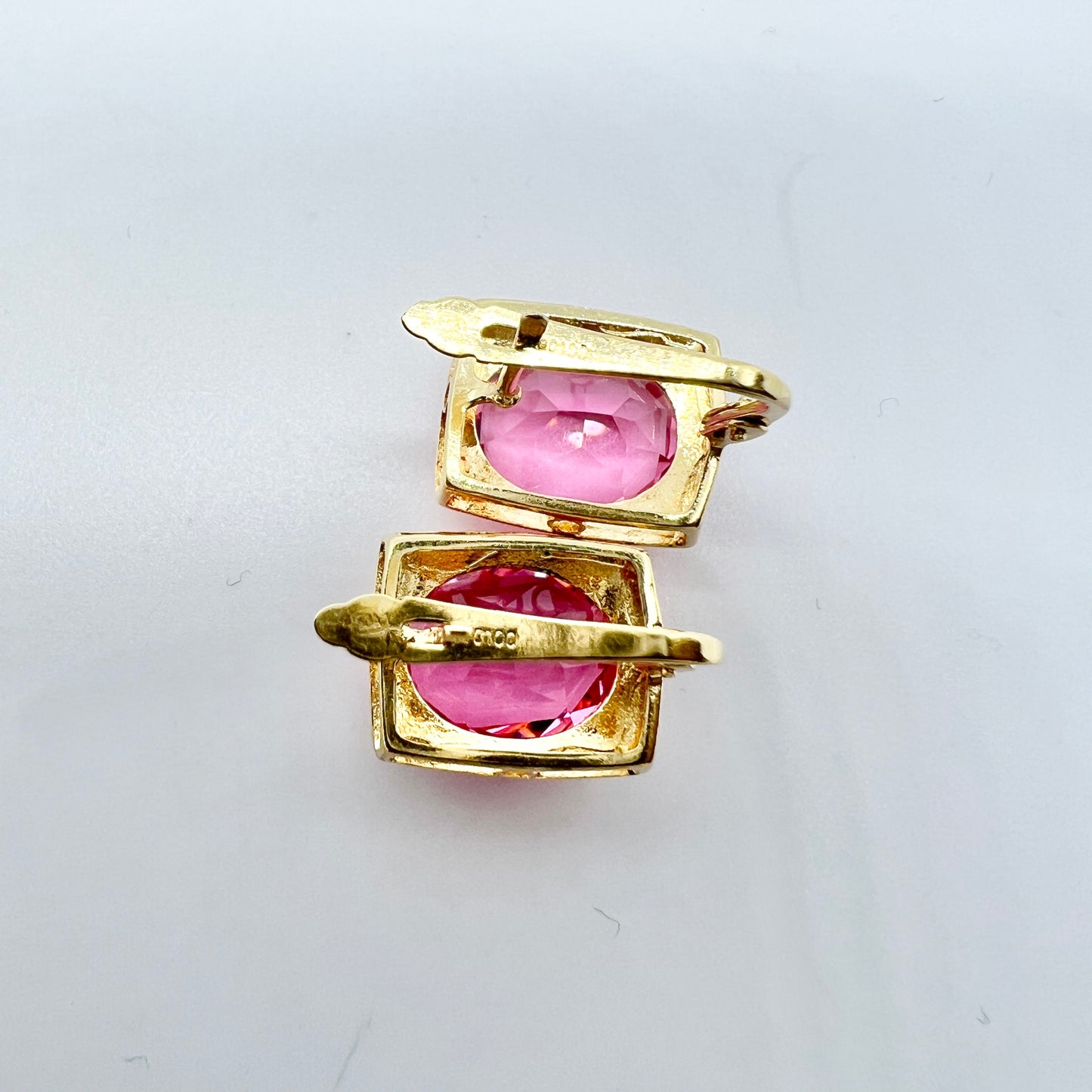 Charming vintage 18k gold pink crystal pair of earrings. Unidentified hallmarks.
