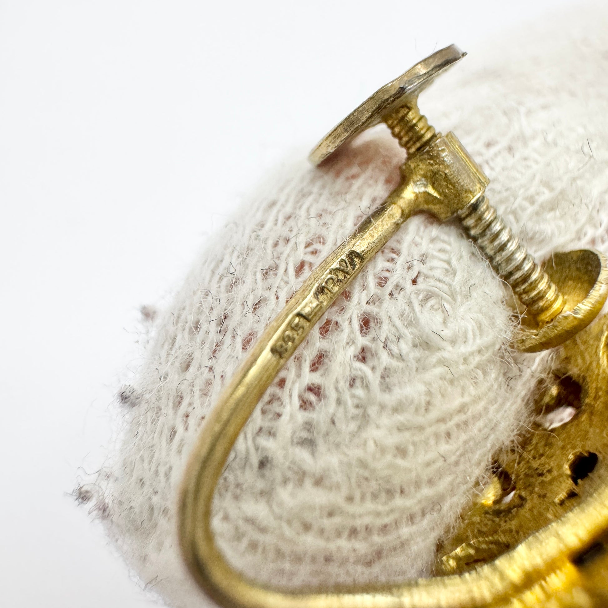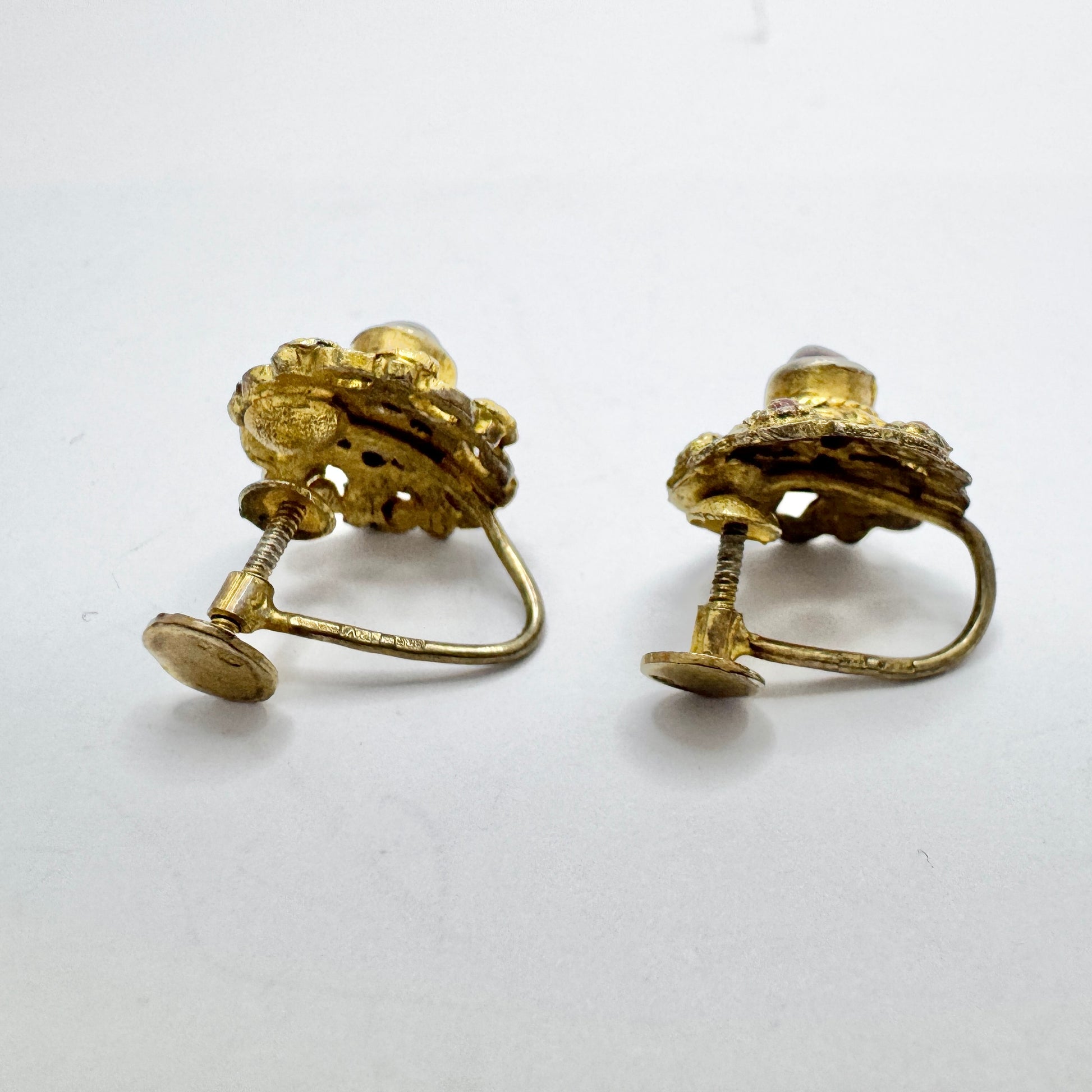 Very charming vintage gilt solid silver garnet enamel pair of earrings. Hallmarked for 835 silver and makers mark PV. Alos with Swedish import marks. Continental Europe ca 1930-40s.