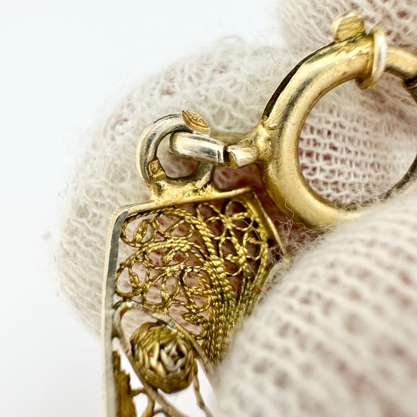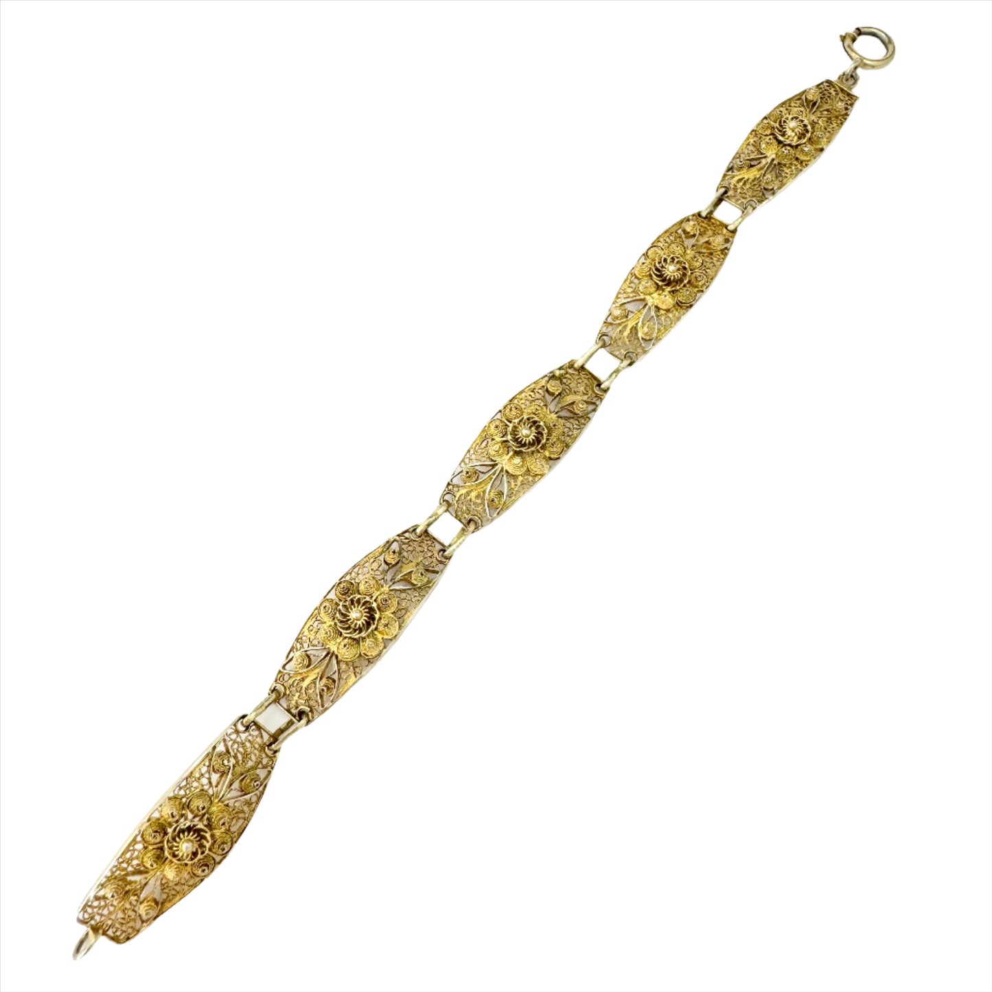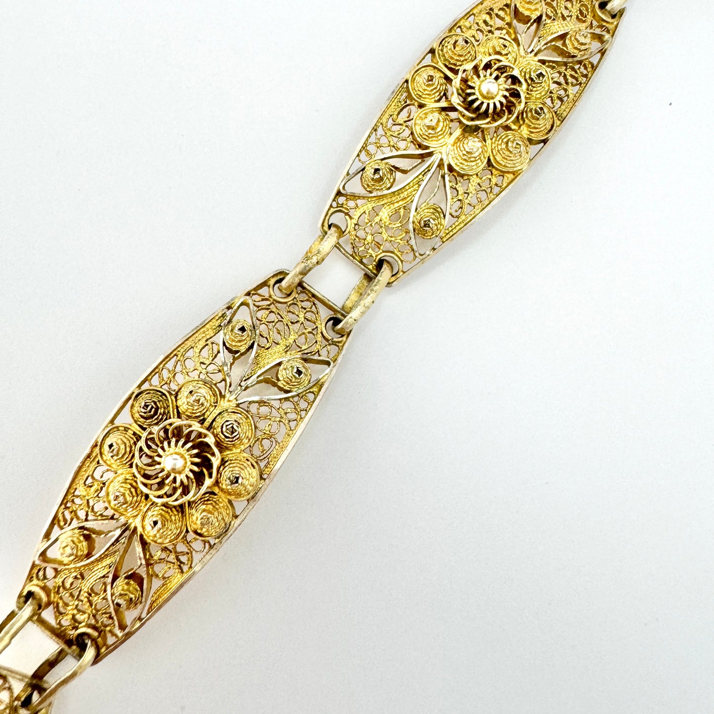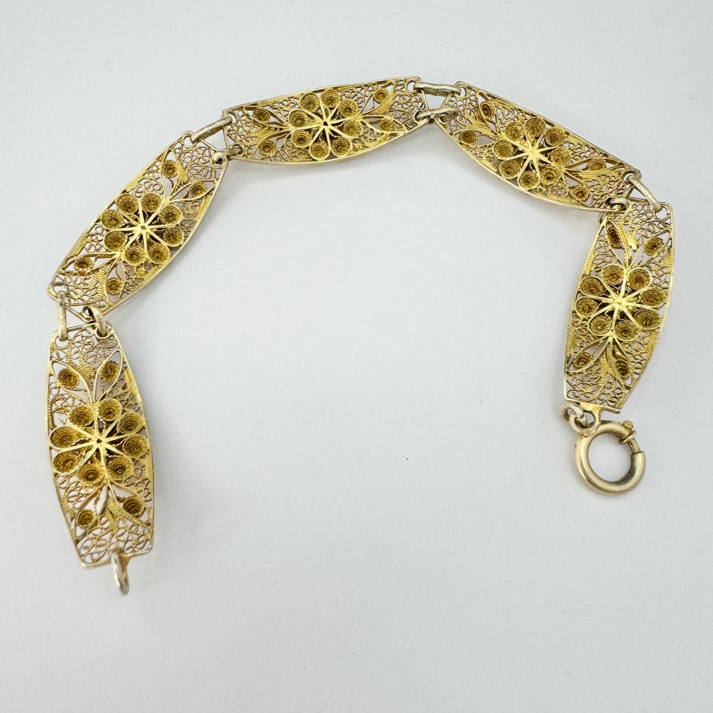 Charming vintage gilt solid silver filigree bracelet. Hallmarked with two tiny hallmarks. Made c 1940-50s, most likely south continental Europe.