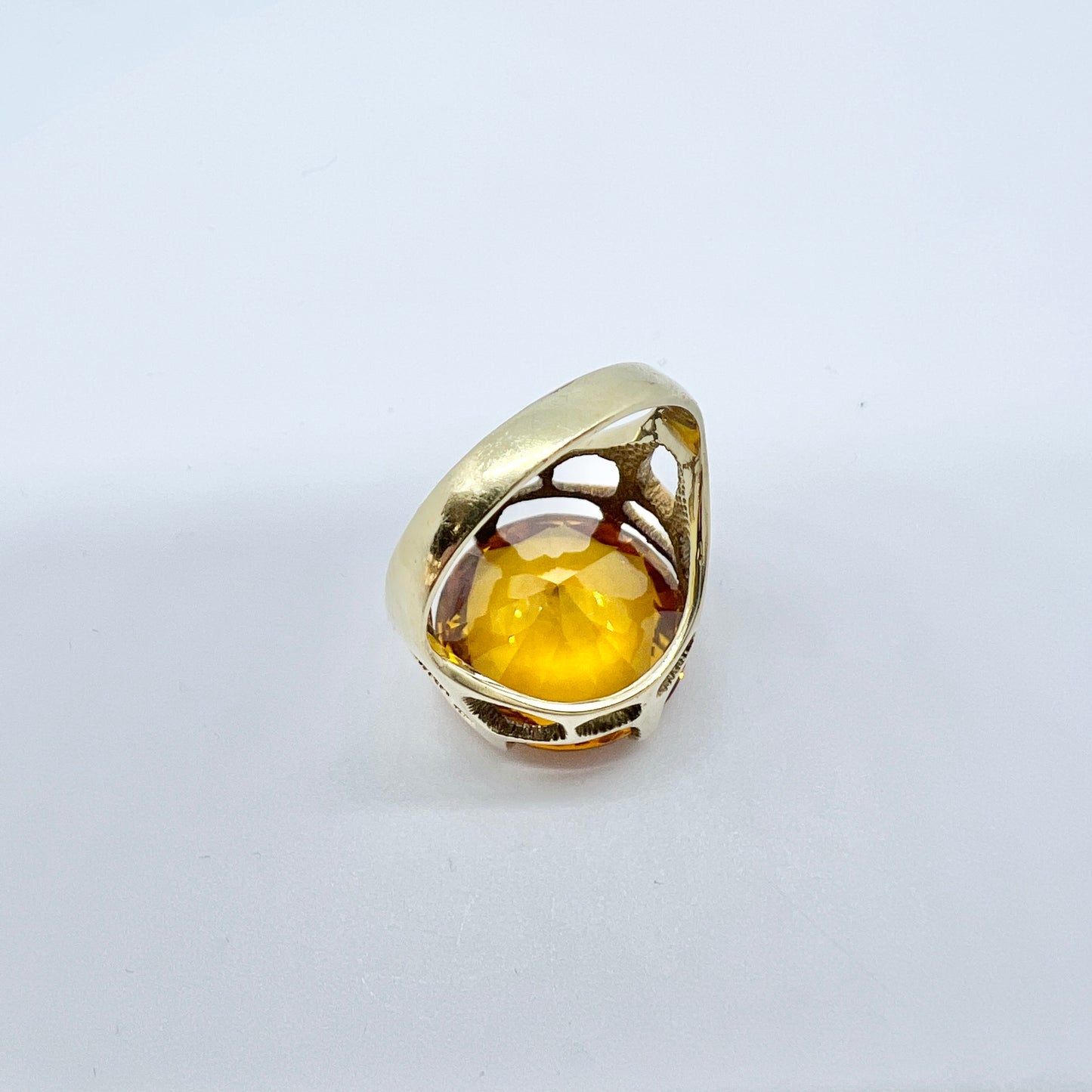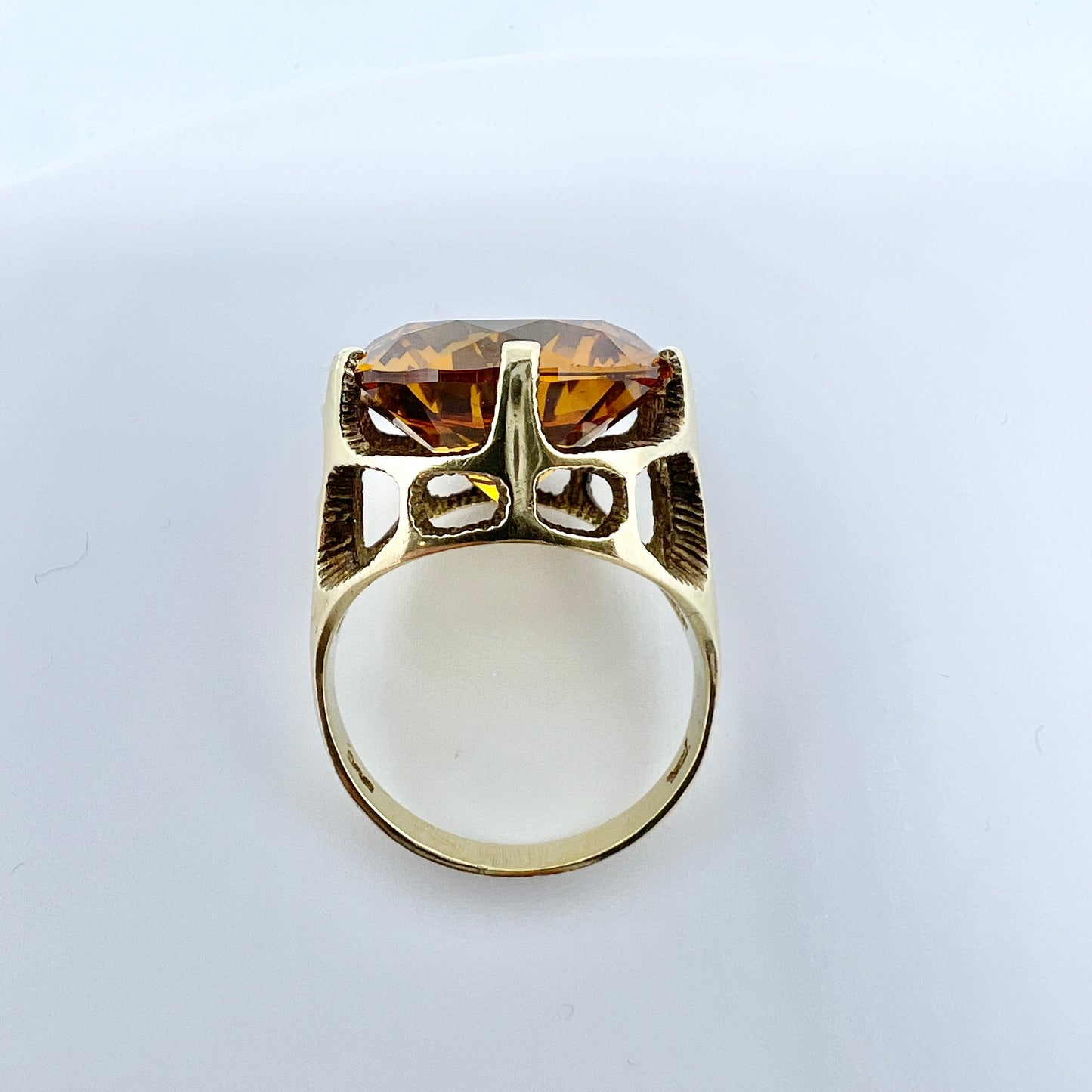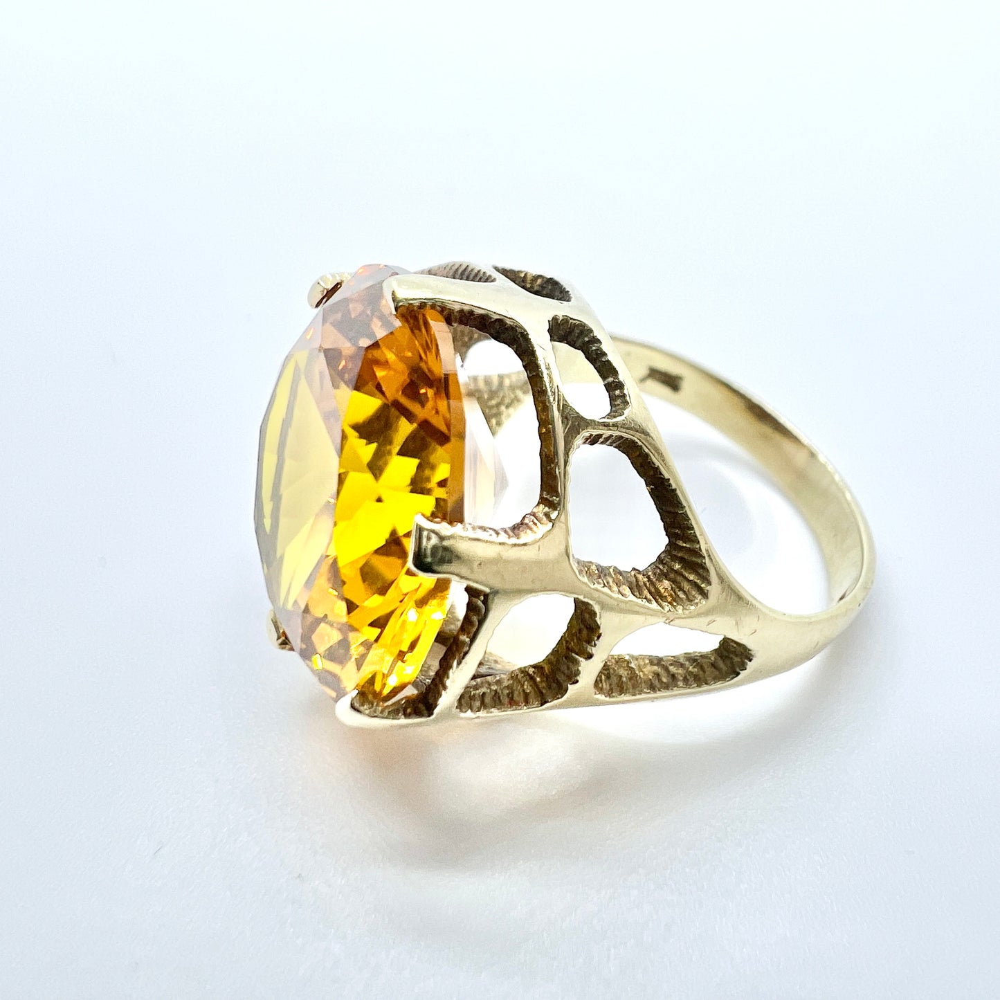 Wonderful and bold vintage 14k gold citrin ring. Hallmarked for 14k gold, and an unidentified makers mark. Possibly Denmark. 1960-70s.
