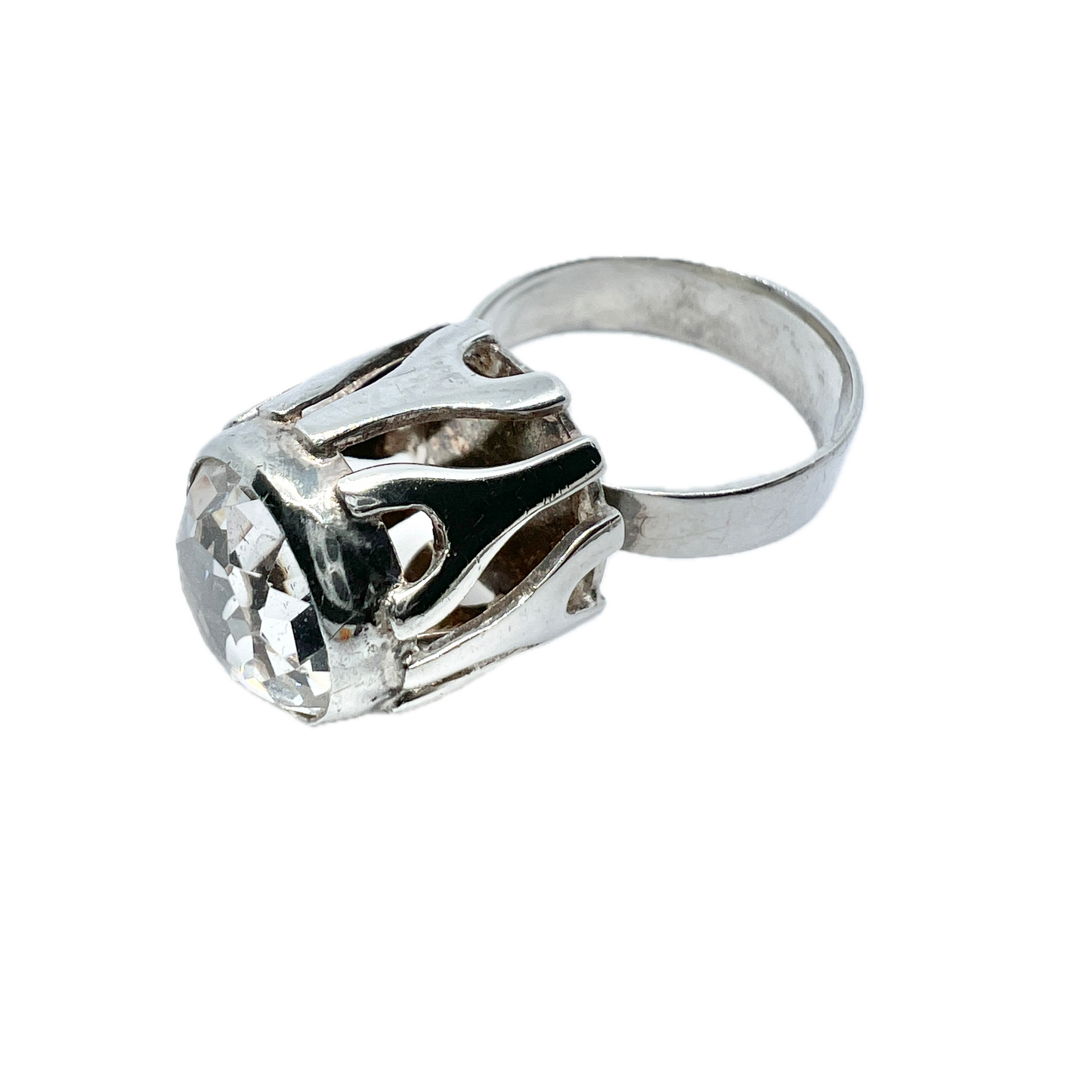 Charming vintage solid silver rock crystal ring. Hallmarked for Swedish import, 835 silver, and an unidentified makers mark. Continental Europe 1960-70s.
