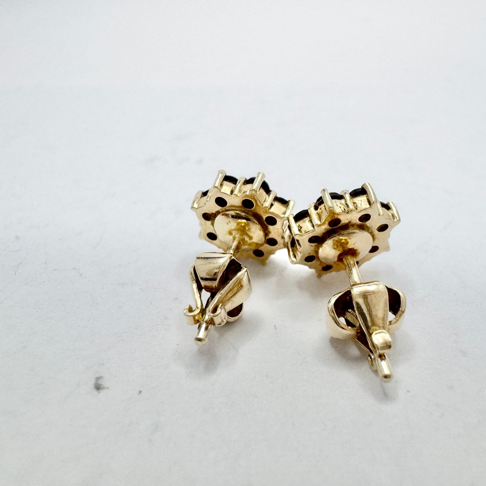 Beautiful and sought after vintage garnet cluster gilt solid silver earrings. Hallmarked with makers mark HE and 830 silver. Vintage ca 1950-60s.
