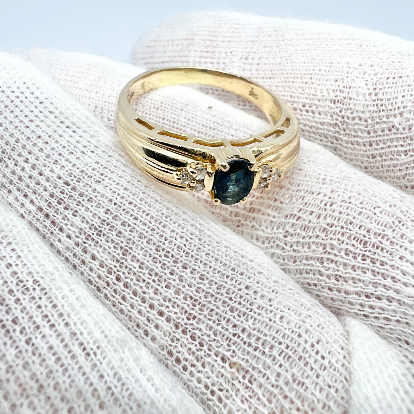 Very charming vintage mid-century 14k gold diamond sapphire ring. Hallmarked for 14k gold, c 1950s.