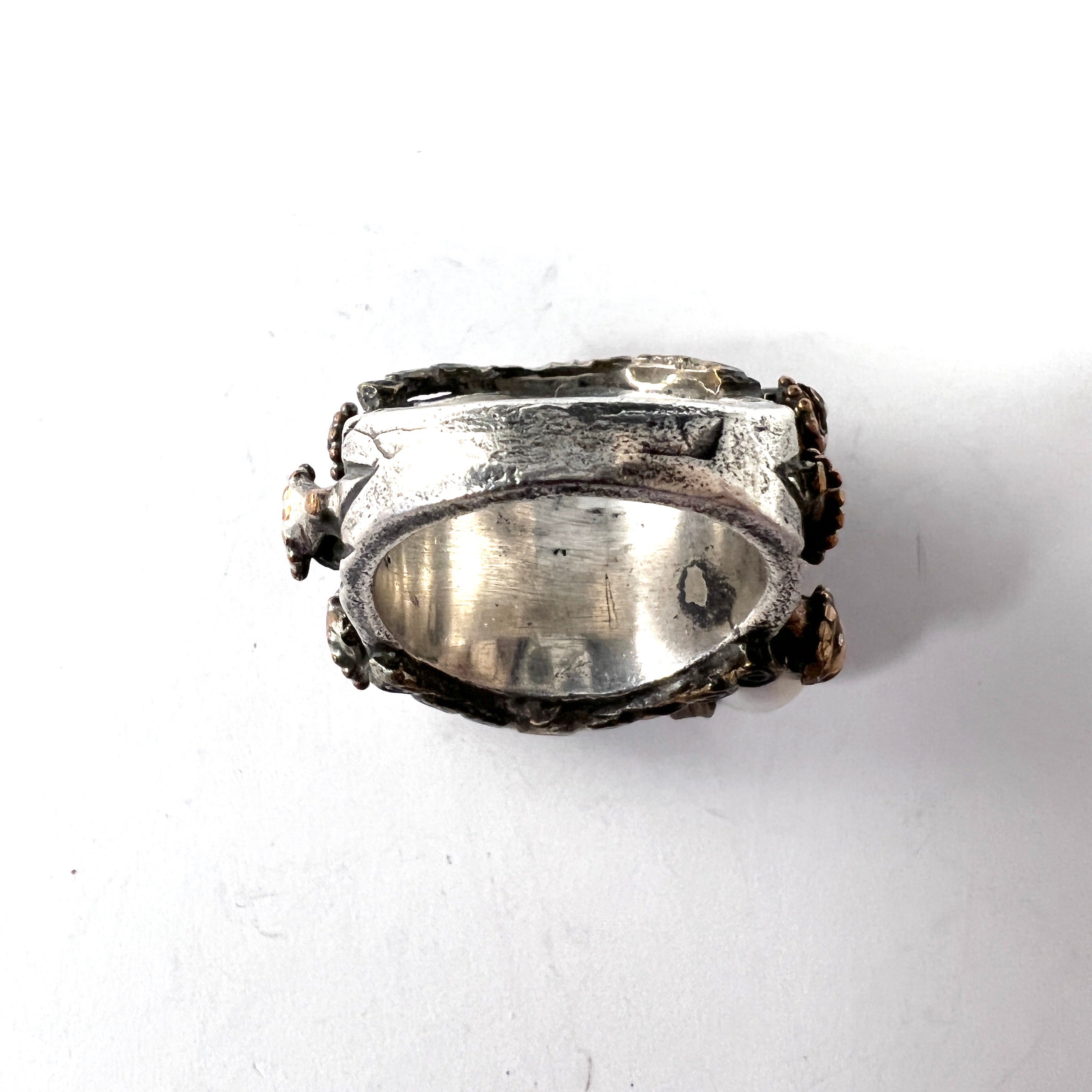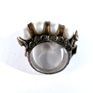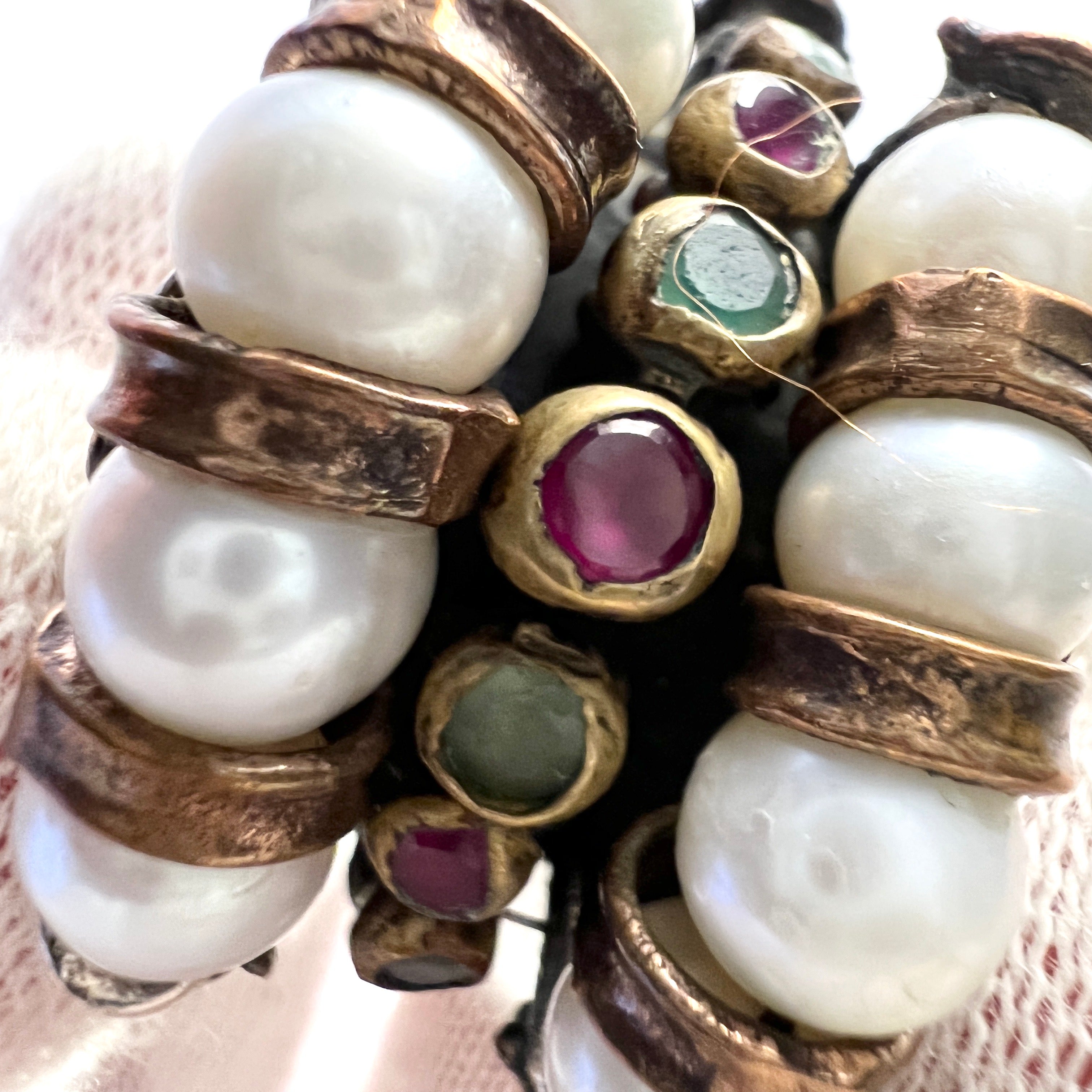 Very interesting and bold vintage sterling multi stone ring. Apparently unmarked. Cultured pearls, and most likely synthetic rubies and emeralds. Partly gilt. Pearls spins in settings.