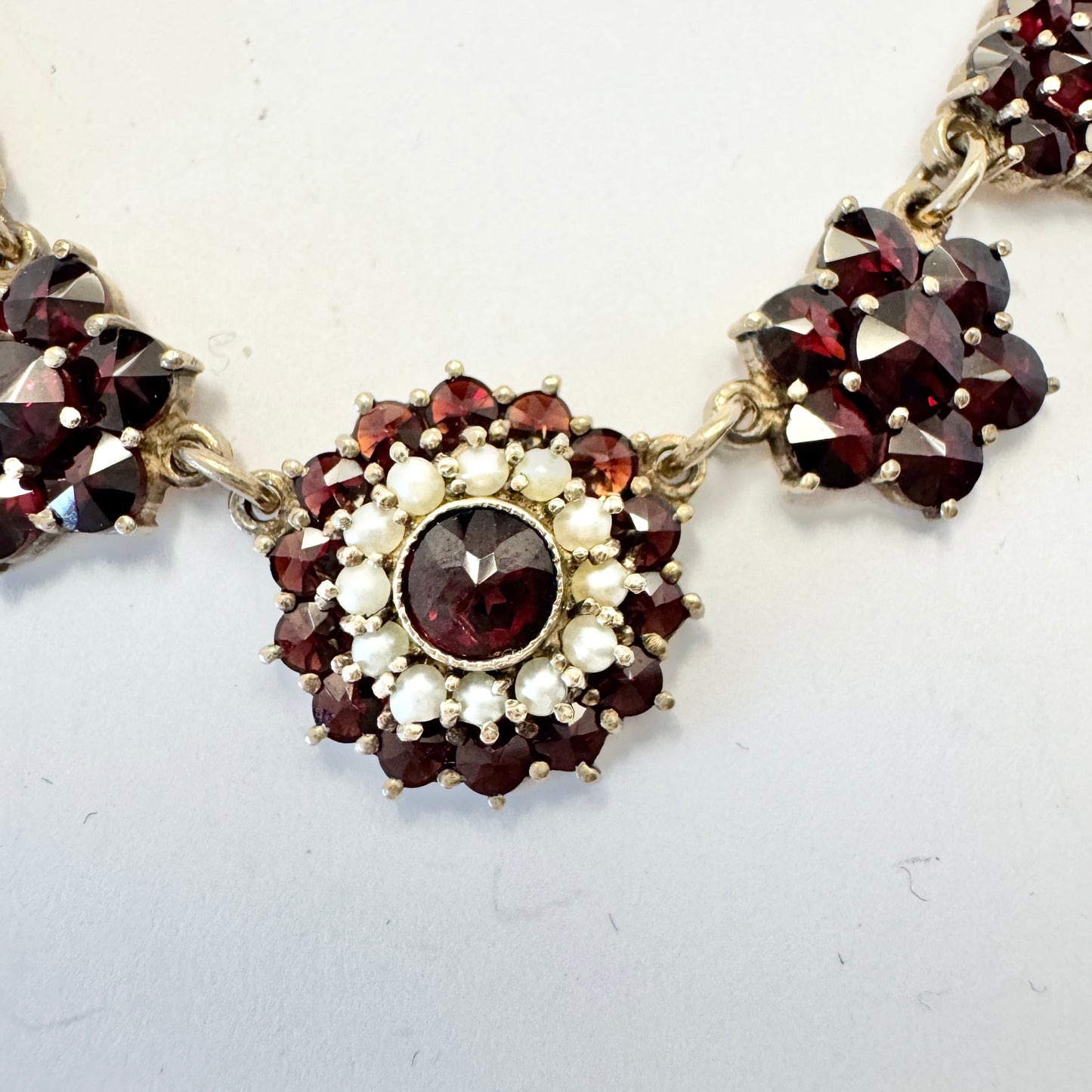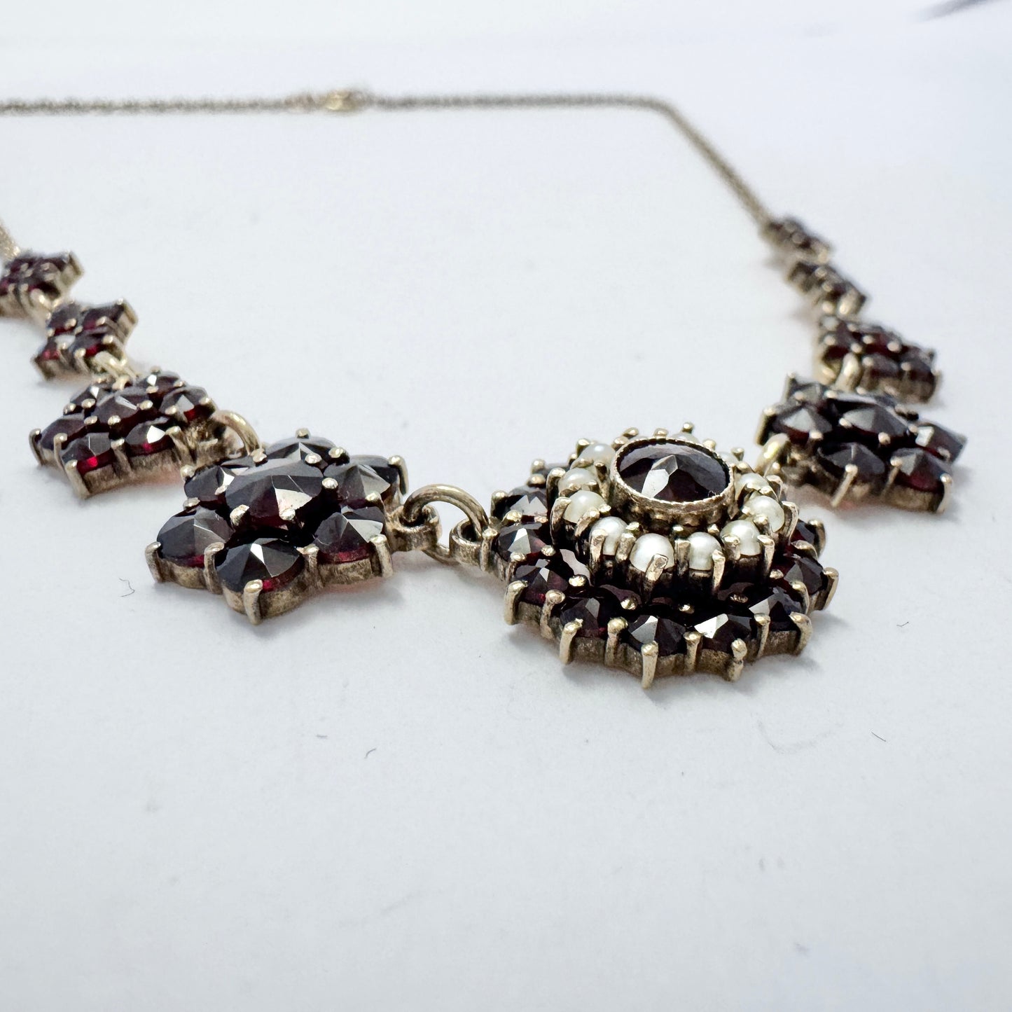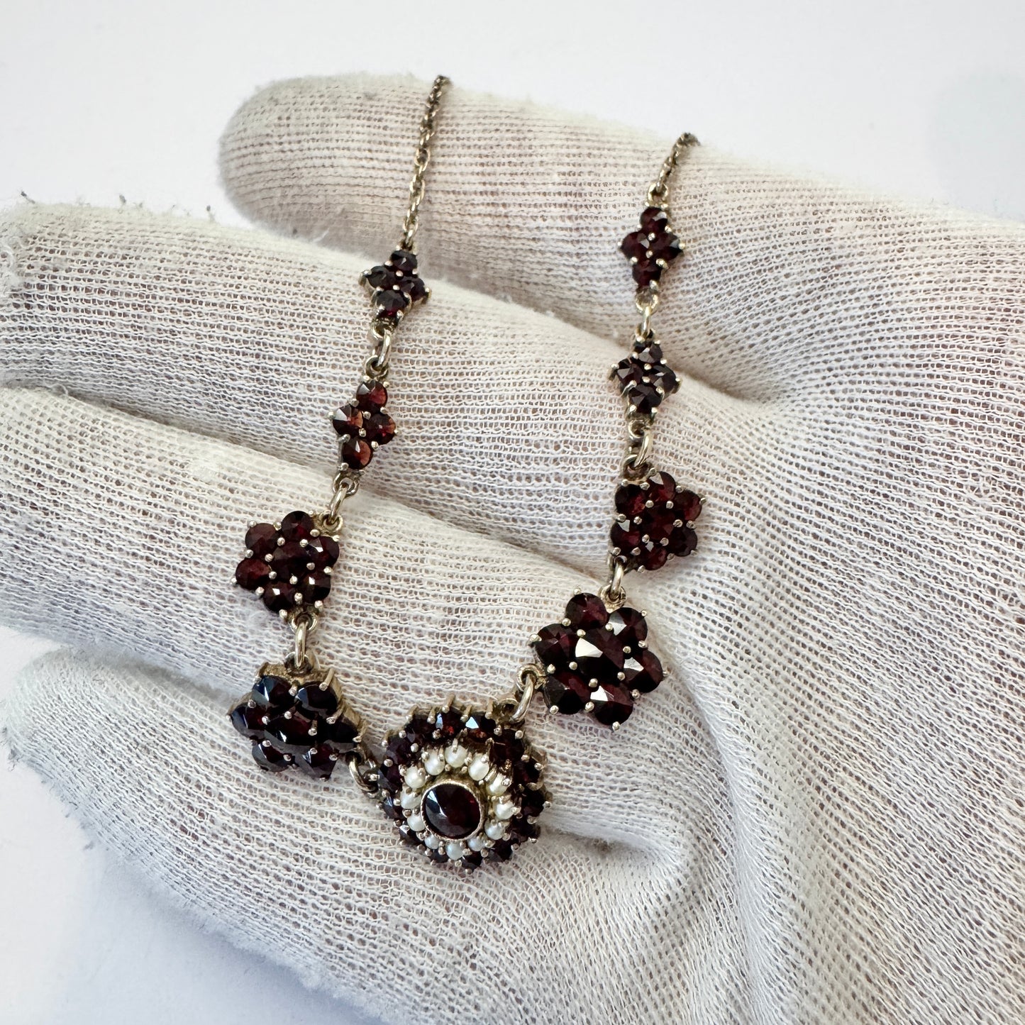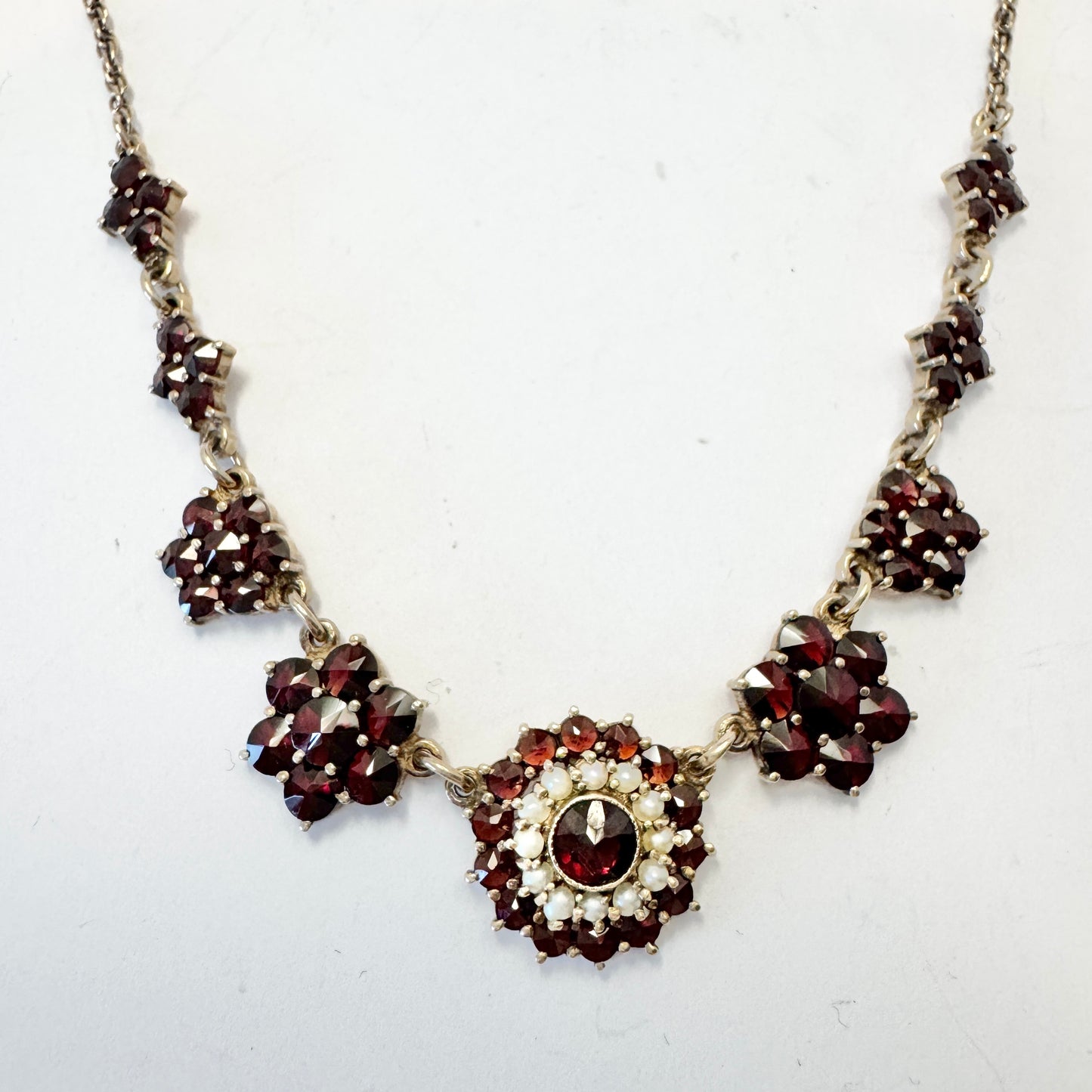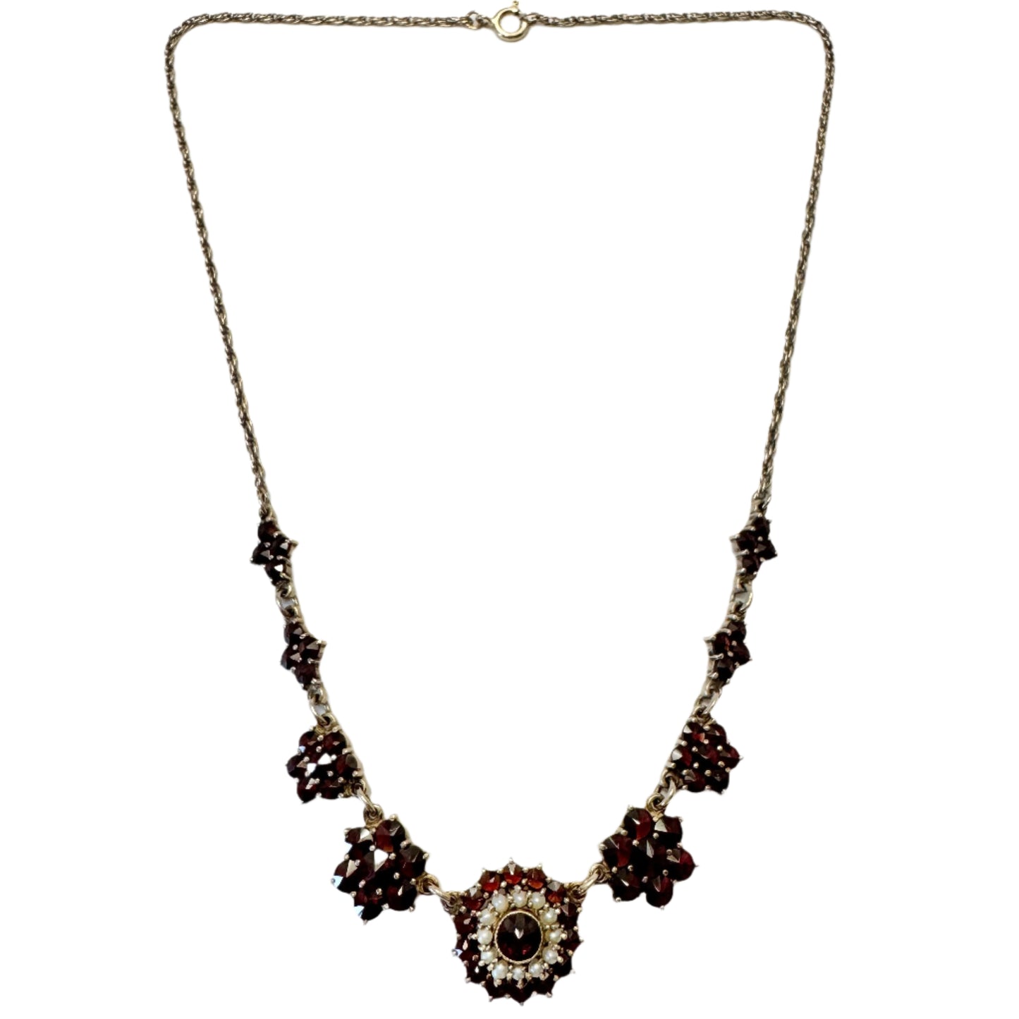 Vintage Gilt Solid Silver Bohemian Garnet Seed Pearl Necklace.