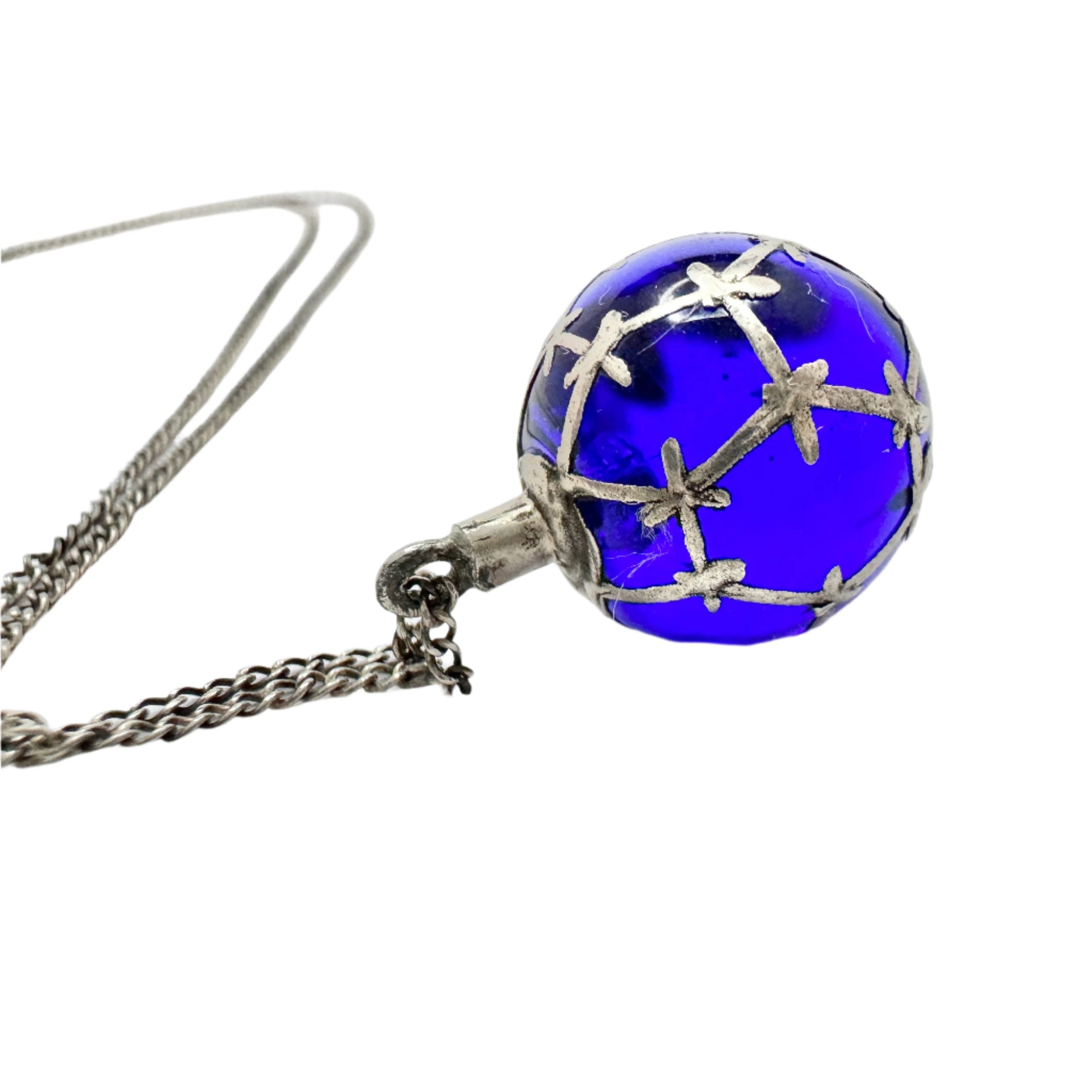 Vintage Solid Silver Blue Glass Pendant Long Chain Necklace.
