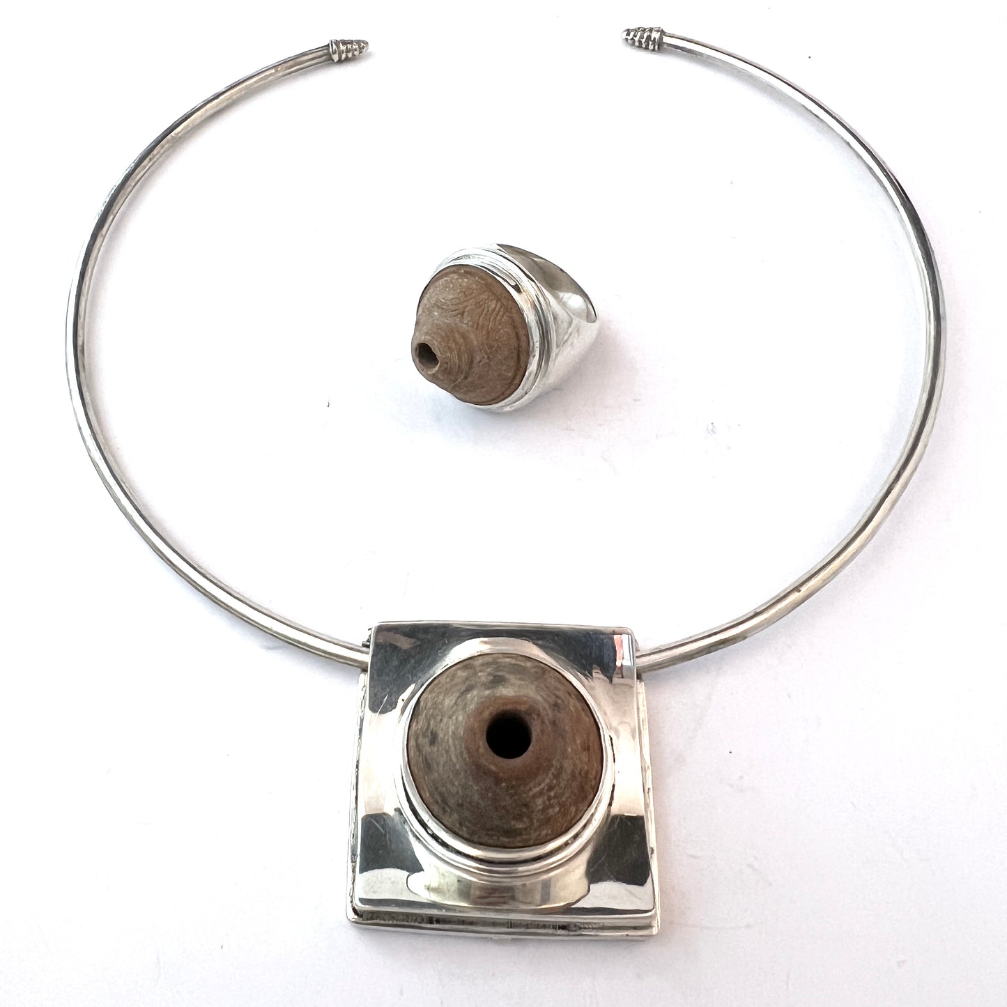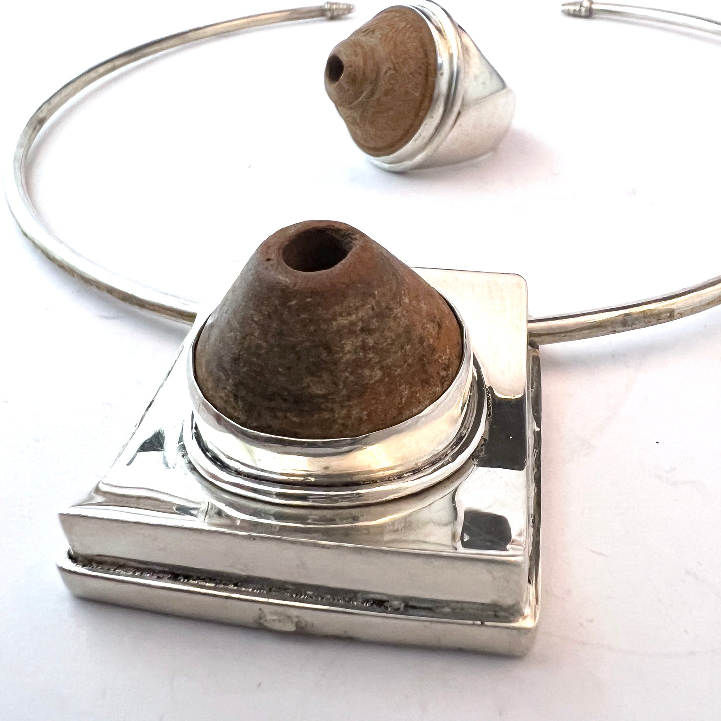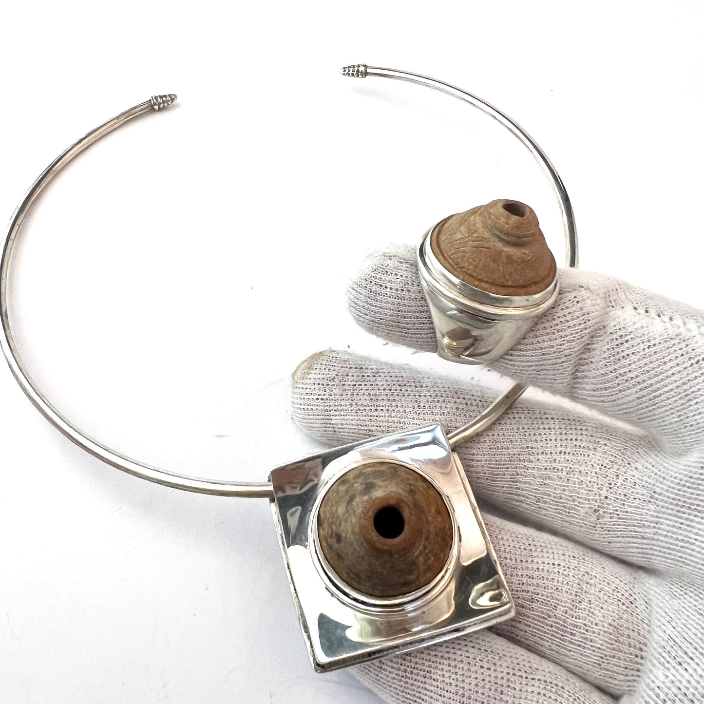 Vintage Sterling Silver Ancient (?) Ceramic Set. Necklace + Ring.